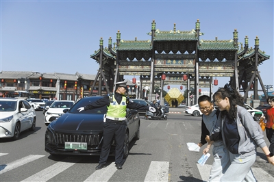 ④国庆中秋假期,市公安局交通管理支队勤务保障大队古城中队民警坚守岗位,保障市民、游客安全顺畅出行。 本报记者 于宏摄