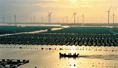 10月4日,在山东省荣成市石岛管理区桑沟湾海洋牧场,渔民出海从事养殖生产。