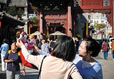 国庆中秋假期,大同文旅火热,诸多文创产品颇受游客喜爱。古城墙下、街巷间,手持大同特色文创产品的游客穿梭打卡,定格欢乐瞬间。图为游客手持“佛小伴”在下寺坡街拍照留念。