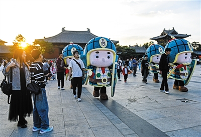 国庆中秋假期,“古城也很潮”文旅演艺活动以大同古城12处地标为舞台,每日下午分时段呈现多场主题演出。表演者以角色扮演、人物秀、街头快闪等方式,让观众感受大同的历史与文化。图为华严寺广场的人偶走秀吸引游客拍照、观赏。