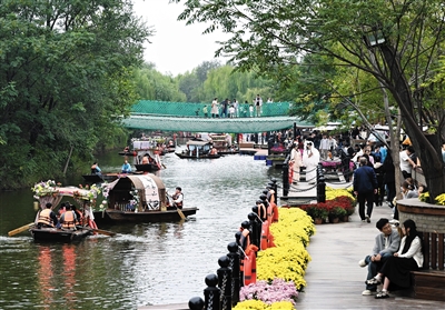 十月七日,游客在河南省开封市万岁山武侠城游玩。