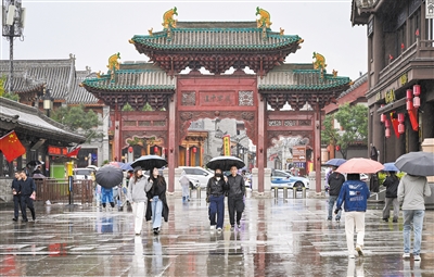 10月8日,一场秋雨带来丝丝凉意,也洗尽喧嚣,让千年古都大同在雨幕中更显静谧悠远。假期接近尾声,游客们兴致不减,或撑伞驻足古寺前,或披雨衣漫步街巷,感受别样古都韵味。图为游客行走在雨中的下寺坡街。
