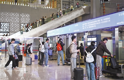 10月8日是国庆中秋假期最后一天,大同南站迎来返程客流高峰。游客带着对历史文化名城大同的美好记忆踏上返程之路,重新投入工作与学习中。图为旅客有序通过安检通道进站。