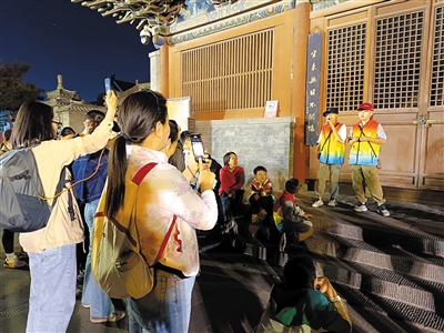 10月3日下午5时,身着彩色马甲、头戴迷你扩音器的李佳睿、于天翊准时“上岗”。他们用孩子独有的视角与语言解读景区,总能跳过复杂的背景介绍,直接点出最有趣的文化亮点:他们会把法华寺比作熟悉的学校,将古建筑的设计智慧称作“古人的创意小发明”,用这样鲜活的类比让厚重的历史“活”起来,变成大人小孩都爱围过来听的“身边故事”。