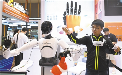 10月15日,在第138届广交会服务机器人专区,展商工作人员演示机器人同步动作。