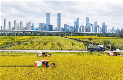 金秋时节,位于浙江杭州萧山区世纪田园粮食功能区的3000多亩水稻迎来丰收,金黄的稻田、飞驰而过的高铁列车和远处的城市天际线构成了独特的城市田园画卷。