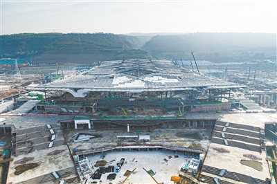 10月27日,西安东站最后一块总重达4800吨的屋盖钢结构桁架顺利提升至33米高空指定位置,标志着西安东站站房主体结构顺利完工。西安东站是集高铁、普铁、地铁、公交于一体的综合交通枢纽,建成投用后车站旅客年发送量预计可达3650万人次。 新华社发(刘翔摄)