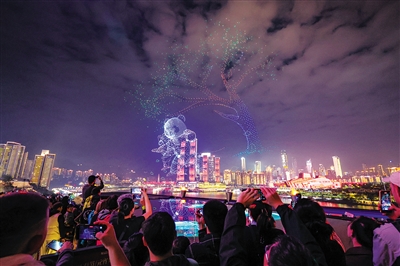 10月27日晚,“新韵重庆”无人机灯光秀举行世界城市日专场表演活动,数千架无人机以“人民城市 智绘未来”为主题,在重庆夜空勾勒出智慧与温情交织的城市图景。