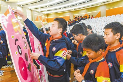 10月28日,平城区清远街道学府社区工作人员走进平城区23校五洲分校,开展未成年人心理健康主题活动。图为学生把心情标签贴到小熊上。 本报记者 韩堃摄