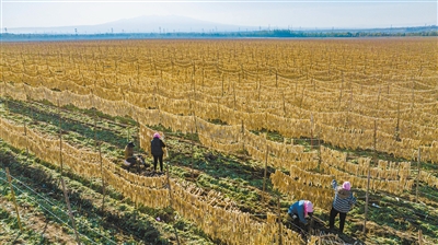 10月29日,农民在宁夏吴忠市红寺堡区红寺堡镇弘德村晾晒萝卜条(无人机照片)。