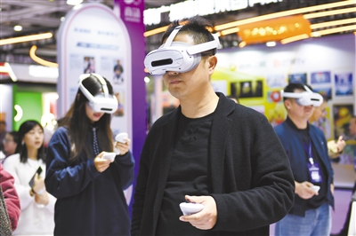 11月12日,观众在2025中国新媒体技术展上体验一款VR设备。
