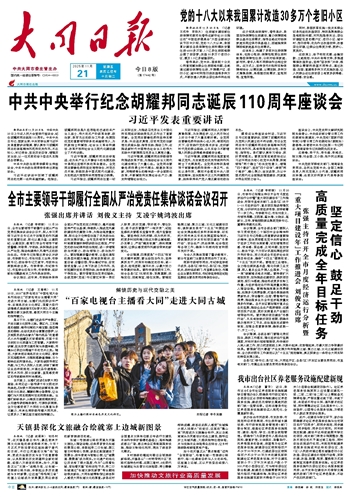 新华社北京11月20日电 中共中央20日上午在人民大会堂举行座谈会,纪念胡耀邦同志诞辰110周年。中共中央总书记、国家主席、中央军委主席习近平发表重要讲话强调,要认真学习胡耀邦同志的崇高精神风范和优良作风,不忘初心、牢记使命,坚定历史自信,增强历史主动,以一往无前的奋斗姿态扎实推进各项事业。
