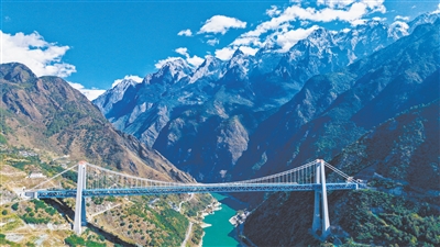 这是11月21日拍摄的虎跳峡金沙江铁路大桥。大桥全长882.5米,起于玉龙雪山隧道出口,止于哈巴雪山隧道进口,是丽香铁路的重点控制性工程(无人机照片)。
