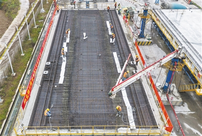 11月23日,在重庆市万州中铁十一局响水镇制梁场现场,工作人员进行最后一榀箱梁的制作(无人机照片)。