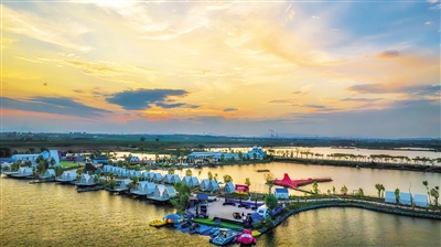 | 开阔的绿草坪上,人群或漫步、或围坐休憩,远处是整齐的农田与连绵的山脉,蓝天流云相映,尽显休闲生活气息。“十四五”期间,云州区围绕桑干河沿线“串珠成链”目标,开展生态修复及服务设施建设,推进桑干河湿地申报国际重要湿地,促进生态与景观深度融合。 |