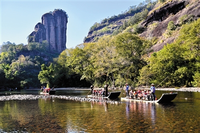 11月30日,游客乘竹筏游览福建武夷山九曲溪。