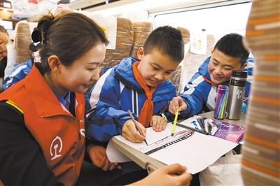 12月7日,学生代表在开往西安北站的复兴号动车组列车上进行铁路主题创意绘画。