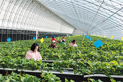 | 西韩岭乡北村华农苑草莓种植基地内,层层叠叠的架上,翠绿的叶片间挂满了一颗颗从嫩黄到鲜红的草莓果实。“十四五”期间,云冈区坚持设施农业“特”“优”发展,温棚总数达4452栋,面积0.57万亩。同时,积极推行“叶菜轮作”“菜瓜共生”“南果北种”“花卉培育”模式,建成全市规模最大的草莓产业园区,叶类蔬菜供应量占全市的70%。 |