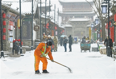 12月12日,我市迎来降雪天气,给城市交通和市民出行带来诸多不便。我市各机关单位、街道社区等以雪为令、闻雪而动,组织人员走上街头清雪除冰保障道路顺畅与市民出行安全。图为环卫工人在鼓楼东街清理积雪。