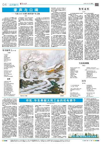 冬至倏至,寒冷充塞天地间,以雷霆之势,令万木萧瑟,生命蛰伏,冷寂的长夜显得尤为漫长。随着冬的脚步,一场接一场雪不期而至。或碎屑筛洒,或鹅毛飞舞,或伴风肆虐。大地失去了春的妩媚、夏的多姿、秋的丰饶,袒露脊骨,冷淡而生硬。如果你据此认为冬是单调的、冷酷的,那就错了。“风掣红旗冻不翻”,这是边塞飞雪的气场;“杖藜雪后临丹壑”,则是文人的凛然风骨。千里冰封,万里雪飘,如果说营造温馨场景,冬一点也不逊色春夏秋。瑞雪笼罩的农舍,雪后初霁的站台,山巅一轮旭日、灯笼一撮堆雪,庙观外一行深深浅浅的脚印,孩童们一张张红彤彤的脸庞,无不是冬日里暖意融融的慰藉。“绿蚁新醅酒,红泥小火炉。晚来天欲雪,能饮一杯无?”一场穿越时空的邀约,温暖了冬日里的所有雪夜。