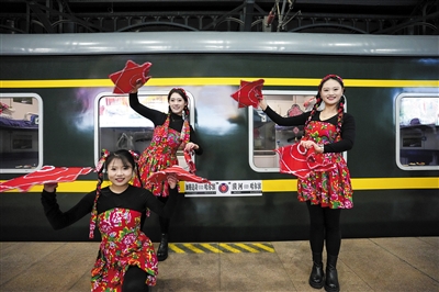 12月22日,演职人员在哈尔滨站站台上为旅客进行民俗表演。