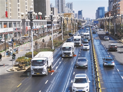 “十四五”时期,我市摒弃“粗放式”管理模式,以“绣花功夫”深耕环卫管理,从清扫保洁、垃圾处置到公厕服务、应急保障,全方位提升服务品质,让城市管理更有温度、民生服务更接地气。图为洗扫车对迎宾街机动车道进行精细化清洗。资料图片