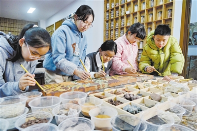 12月20日,参加武夷山市文化馆岩彩画公益课程的孩子们在合作创作岩彩作品。