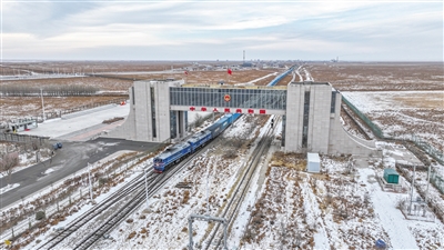 12月22日,一列中欧班列通过内蒙古二连浩特铁路口岸入境(无人机照片)。