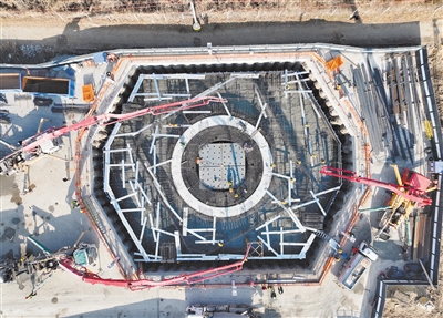 中铁十一局工人在石雄铁路跨朔黄铁路特大桥176号墩转体桥承台浇筑现场作业(12月23日摄,无人机照片)。
