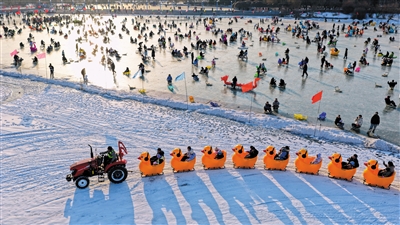 12月28日,大同天气晴好,文瀛湖生态公园嬉冰场人气爆棚,不少市民全家出动,体验冰车、冰上自行车、雪地摩托等趣味项目。冰面光影交错,欢声笑语不绝于耳,冰雪场地让市民在家门口乐享冬日乐趣,为城市冰雪经济发展注入活力。 本报记者 张占兵摄