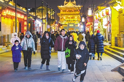 2025年12月31日晚,大同古城内张灯结彩、人潮涌动,众多市民、游客漫步街巷,观看精彩文艺表演、探访文创手作小店、品尝传统特色美食……共同迎接新年的到来。图为市民、游客在鼓楼东街游览。 本报记者 张燕伟摄
