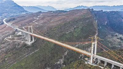 近日,贵州安(安顺)盘(盘州)高速天门特大桥主体工程顺利完工。天门特大桥是安顺至盘州高速公路的重要控制性工程,大桥全长一千五百五十三米,桥面距离峡谷水面约五百六十米。 新华社记者 陶亮摄