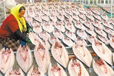 1月6日,山东省青岛市即墨区鳌山卫街道渔民在晾晒鱼干。