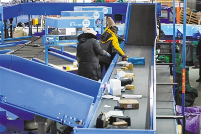 1月7日,灵丘县中源物流仓储基地全自动快递分拣流水线高效运转,工人有序分拣快递。