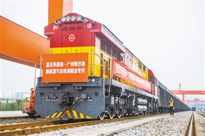 1月7日,一列满载108台“重庆造”新能源汽车的铁海联运专列,从重庆果园港鱼嘴站发出,预计在48小时后抵达广州南沙港,随后换装海轮运往中东市场。