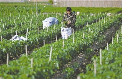 1月8日,农民在海南省澄迈县瑞溪镇金安洋蔬菜种植基地采收辣椒。