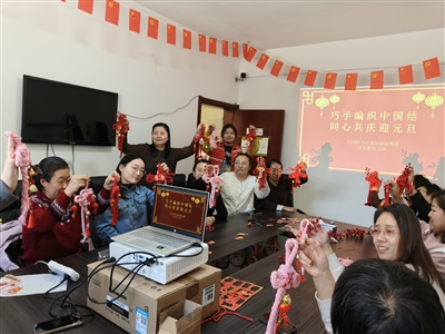 民安社区的活动现场暖意融融,红绳、流苏等物料整齐陈列,喜庆氛围扑面而来。钩编白老师一边讲解中国结的千年文化底蕴,一边示范基础编法,指尖翻飞间,松散红绳渐成雏形。她穿梭在居民中间手把手指导,耐心纠正编结力道与纹路。居民们围坐钻研、互帮互助,一个个鲜红饱满的中国结陆续成形,承载着对新年的期许,大家举着作品展示留念,活动室里笑声不断。