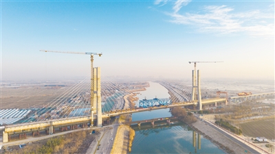 这是1月9日拍摄的沪宁合高铁南京特大桥跨滁河斜拉桥(无人机照片)。