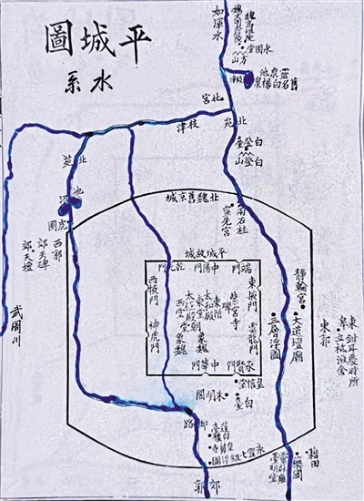 8. (水系)北魏平城的水系,不仅是维系都城生存与繁荣的命脉,亦是一个逐水草而居的游牧族群,在入主中原进程中至关重要的精神寄托。此水系巧妙融合自然河流与人工渠网,构成一套复杂而高效的系统,堪称中古以前大型都城水利工程的典范。平城水系之骨架,由《水经注》所载两条河流支撑:源出北山的如浑水(今御河),与自西山而来的武周川水(今十里河)。如浑水作为城东干流,穿郭城而过,流经宫城东侧,主导城市生活、南郊灌溉及东苑供水;武周川水则凿渠引向西北,然后亦向南穿行,成为西苑、鹿苑、北苑及宫城西部的核心水源。
