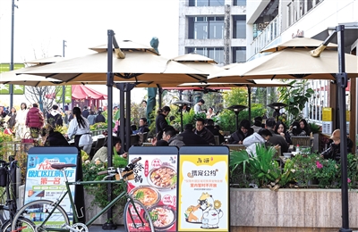 1月10日,消费者在上海市徐汇区西岸梦中心一家商铺外摆区域享用美食。