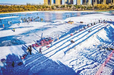 近日,位于文瀛湖生态公园东北区域的冰趣雪乐园正式开门迎客。乐园依托2万平方米天然湖面打造,以3.5米高的网红“冰糖葫芦树”和“趣味砸冰寻宝”两大特色玩法迅速“出圈”。园内还有“雪滑道”“铁锅炖大鹅”等项目,同时设有暖心休息区。这里成为市民冬日亲子遛娃的热门打卡地,为古都冬日注入满满活力。图为1月12日,市民在冰趣雪乐园内畅玩。