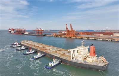 1月13日,一艘轮船在拖轮协助下向唐山港曹妃甸港区矿石码头靠泊(无人机照片)。