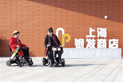 1月15日,顾客在上海银发商店门口体验电动轮椅。