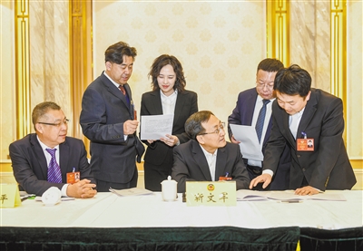 图为分组审议间隙,文艺、社会福利和社保等界别的委员聚在一起,结合各自工作就促进我市文旅“淡季不淡”进行讨论。