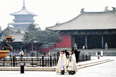 1月25日下午,我市飘起小雪。纷扬的雪花为大同古城披上银装,吸引众多游客和市民漫步其中,赏雪拍照,享受这宁静美好的时刻。图为游人在华严广场游玩拍照。 本报记者 张燕伟摄