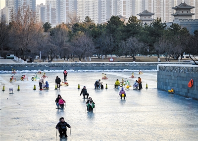 1月25日,大同古城东城墙外护城河冰面上,众多市民、游客欢快地玩着冰车,尽情享受冬日冰上休闲运动带来的乐趣,现场洋溢着欢乐祥和的氛围。