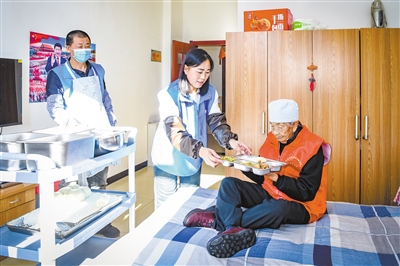 近日,记者在阳高县龙泉敬老院看到,老人们正在吃着丰盛的午饭。该敬老院聚焦五保户老人养老需求,为97名入住老人打造温馨宜居的生活环境,院内处处干净整洁,适老化设施齐全,尽显人文关怀。食堂秉持营养均衡理念,每日精心搭配荤素菜品,兼顾口感与健康,让老人吃得放心舒心。该院以细致服务筑牢养老保障网,让五保户老人在“大家庭”中实现老有所养、老有所安,切实感受到社会温暖。图为护工为行动不便的老年人送来午饭。 本报记者 韩堃摄
