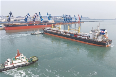 一月二十六日,“烟台港-塞内加尔达喀尔港”航线首班货轮从山东港口烟台港起航(无人机照片)。