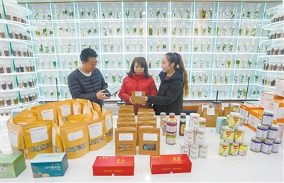 1月26日,游客在宁夏固原市隆德县中医药科普体验馆内选购康养产品。