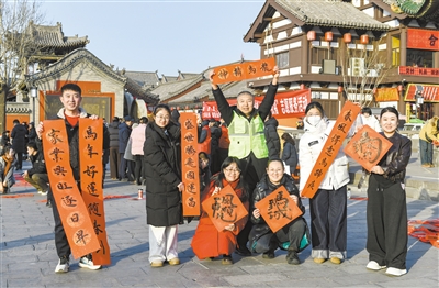 1月28日下午,大同古城鼓楼西街纯阳宫广场,市直机关、大同证券、银星金店党支部联创共建暨“文化润党建、新春送祝福”志愿服务活动举行。党员志愿者以笔墨传情、以服务暖心,为文化古都添“福”彩,助力大同文化之城建设。活动现场,身着马甲的党员志愿者凝神书写春联、福字。此次活动现场书写春联近300副,累计送出2300余副,红墙灰瓦的古建背景与喜庆的红色春联相映成趣,让古都大同洋溢着浓浓的节日氛围。图为市民、游客展示收到的春联、福字。 本报记者 于宏摄